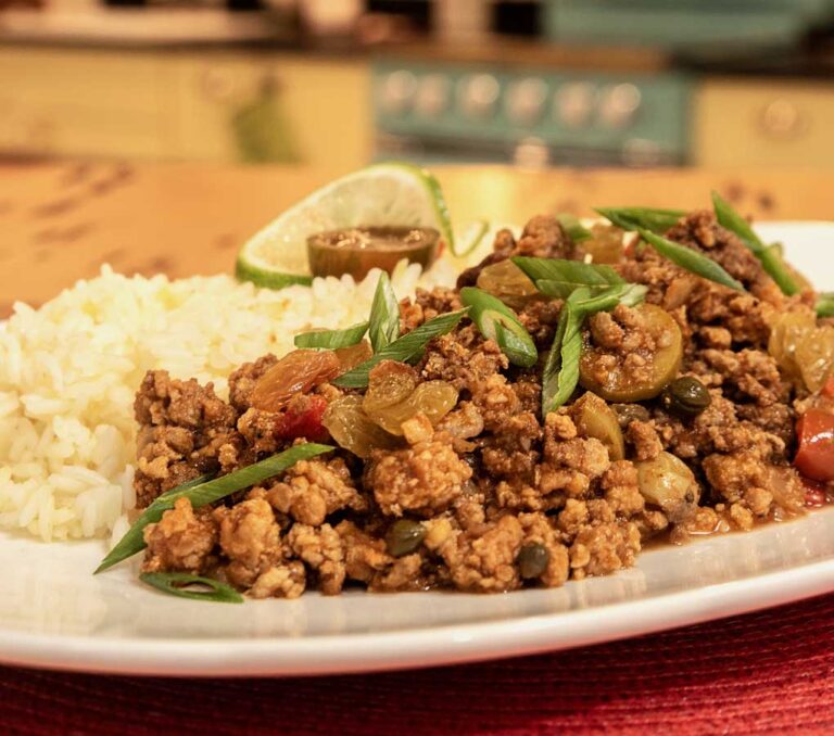 This savory Cuban dish, Picadillo, features ground beef simmered with tomatoes, olives, raisins, and spices, resulting in a perfect balance of sweet and salty flavors.